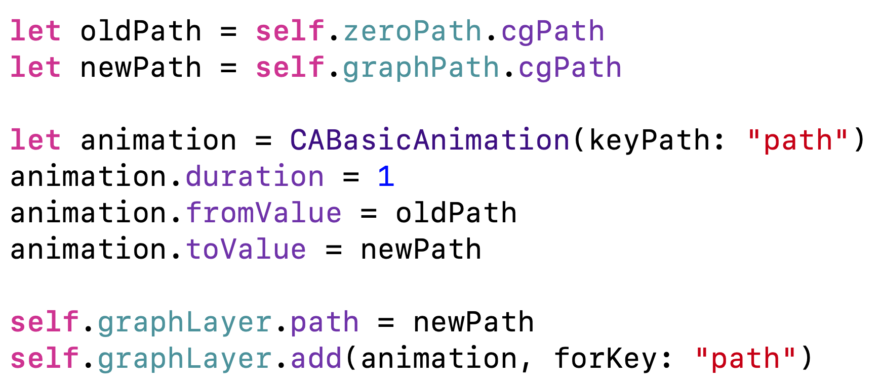 fromValue에 zeroPath(= oldPath). toValue에 graphPath(=newPath)를 넣어주면 됩니다.