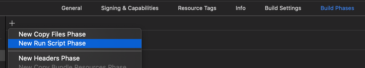 자 그럼 사용해봅시다. Build Phases에 가서 New Run Script Phase
