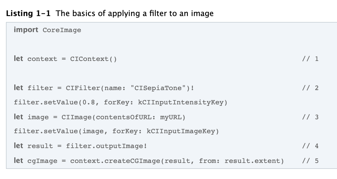 Article Processing an Image Using Built-in Filters Apply effects such as sepia tint, highlight strengthening, and scaling to images. OverviewYou can add effects to images by applying Core Image filters to CIImage objects. Figure 1 shows three filters chain