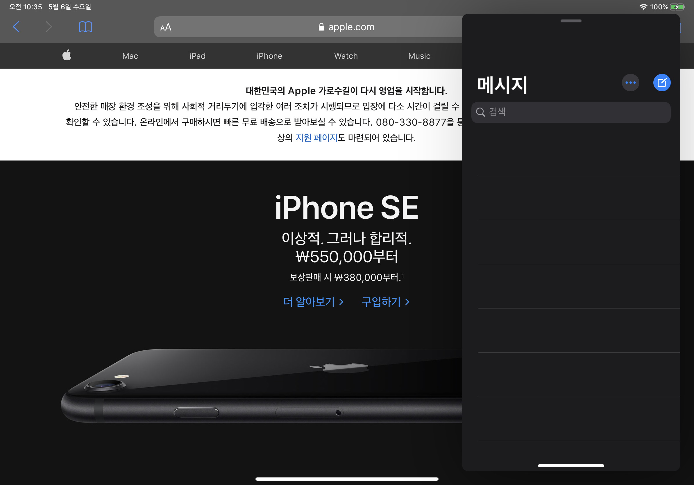 스플릿으로 안하고 이렇게 다른 앱을 오버레이 형식으로 띄울 수 있는데요, 이건 Slide Over라고 해요.