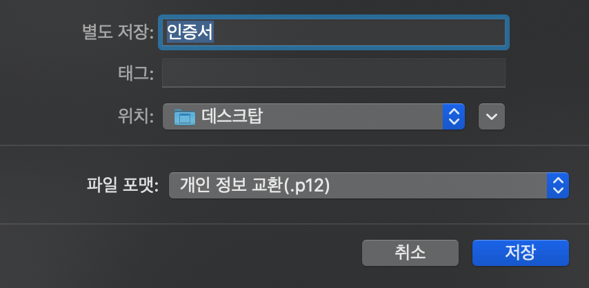 p12타입으로 내보내셔야하고, 이름은 아무거나 지정해주세요.