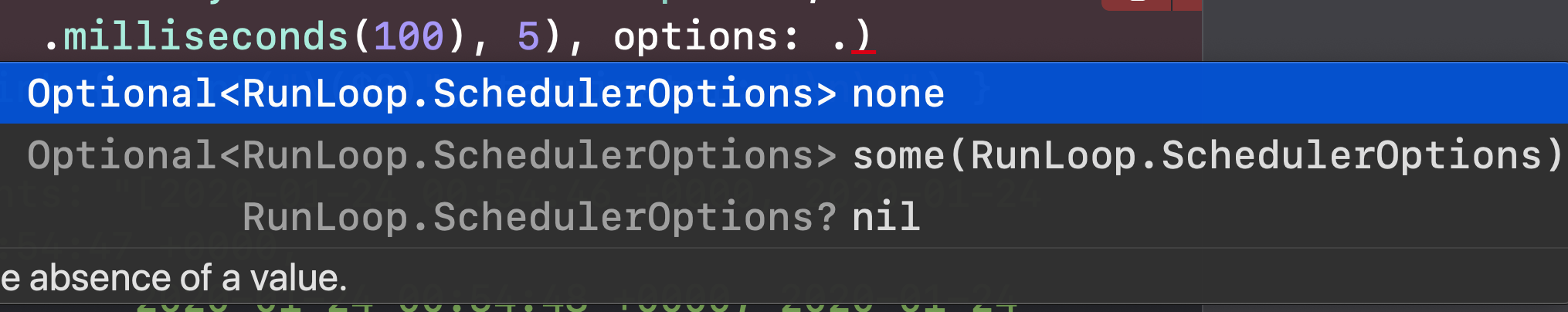 이런것들을 넣을 수 있습니다. 보면, RunLoop.SchedulerOptions를 넣을 수 있죠. 그럼 제가 DispatchQueue를 넣으면?