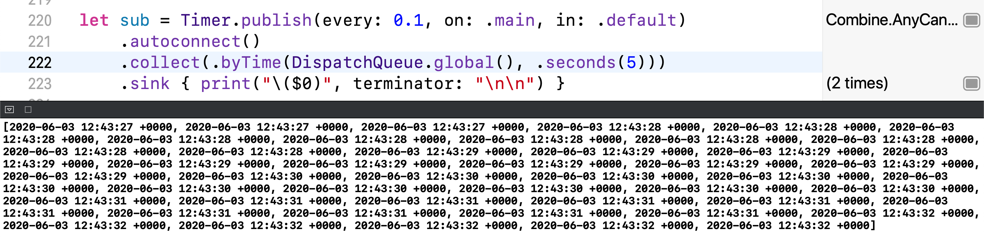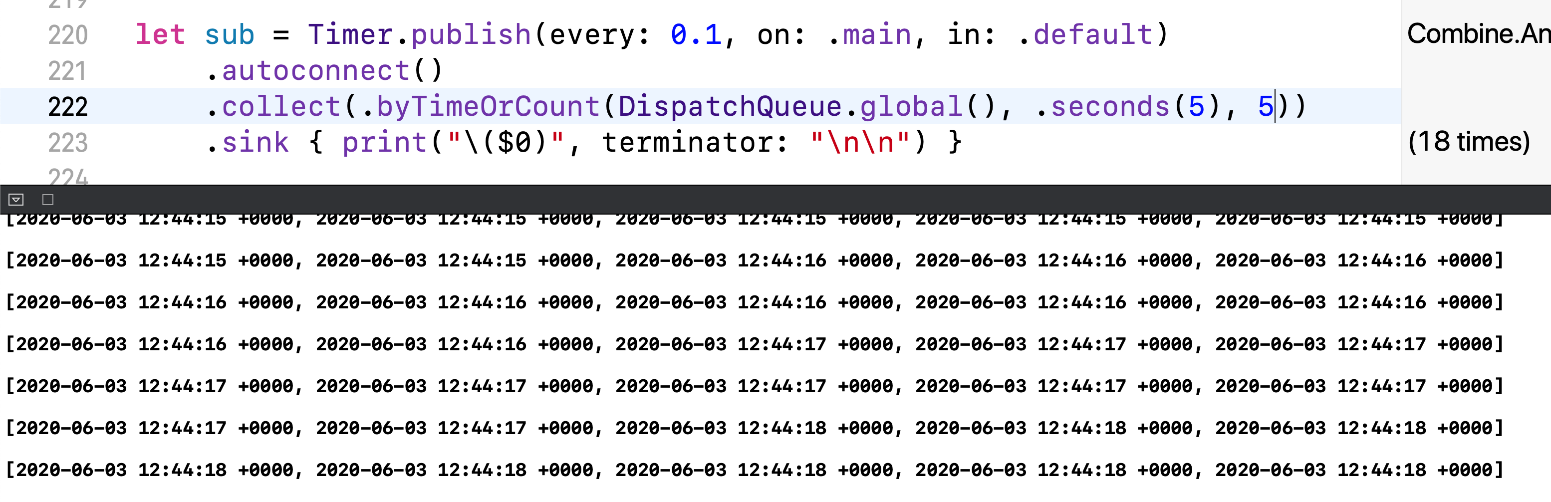 제가 Timer의 stride를 1에서 0.1로 바꾸겠습니다. 그럼 0.1초마다 Date를 방출할거고, 현재 Stride는 5니까 배열에 요소수가 조금 많아지겠네요 그렇죠?