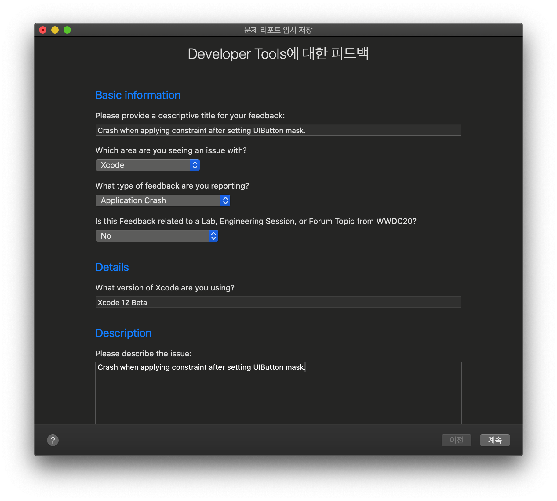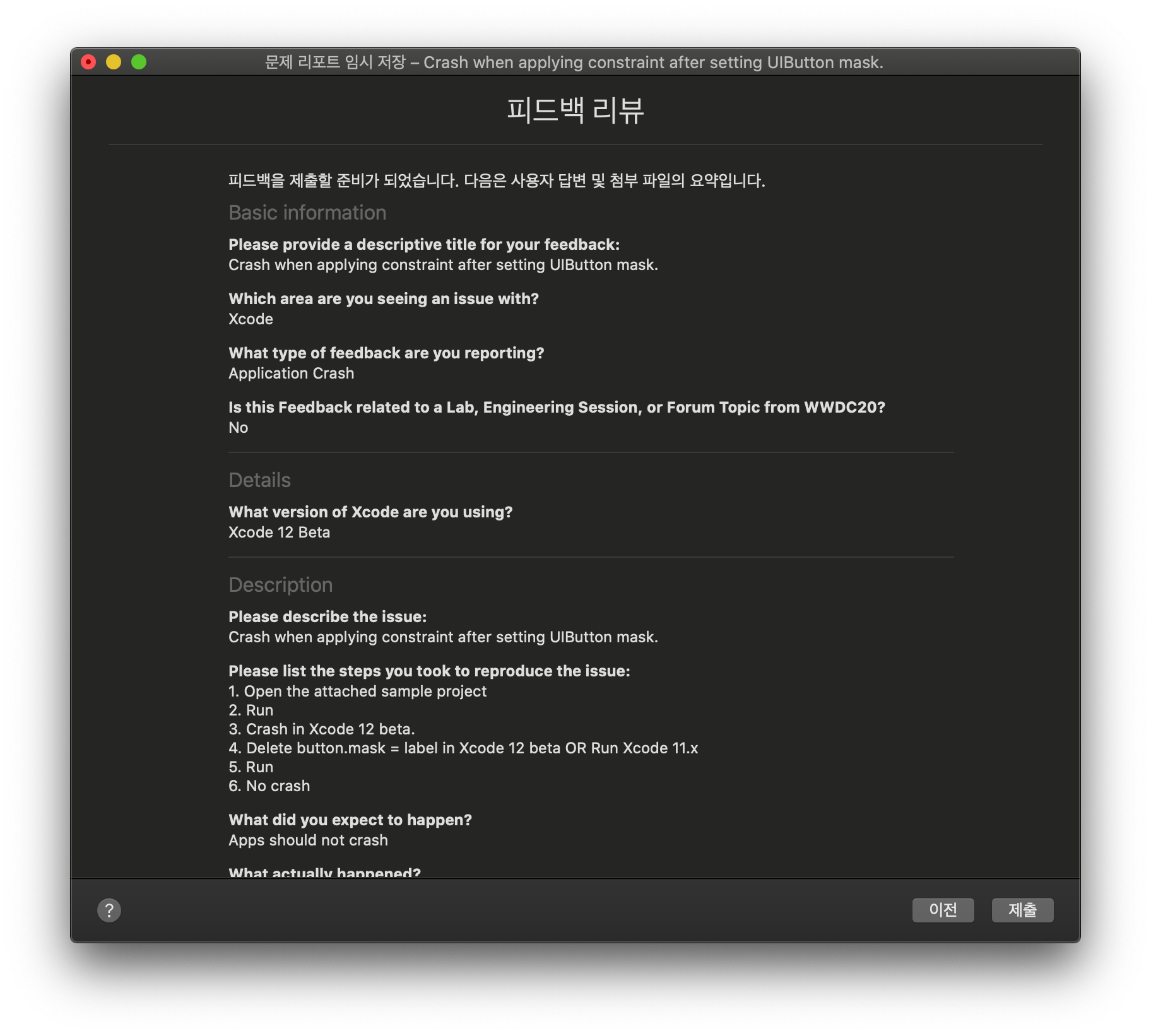 저는 Xcode 12에서 crash나는 이슈가 있어서 버그 제보를 해보려고해요.