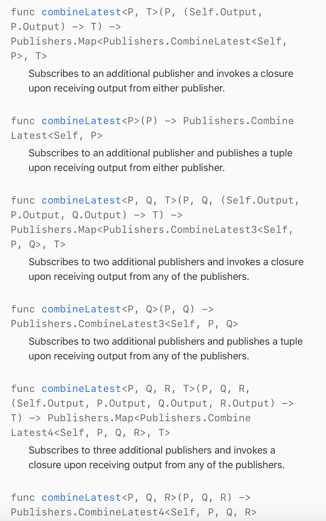 참고로 combienLatest의 publisher가 완료(finish)되려면 모든 업스트림 publisher가 완료되어야합니다.