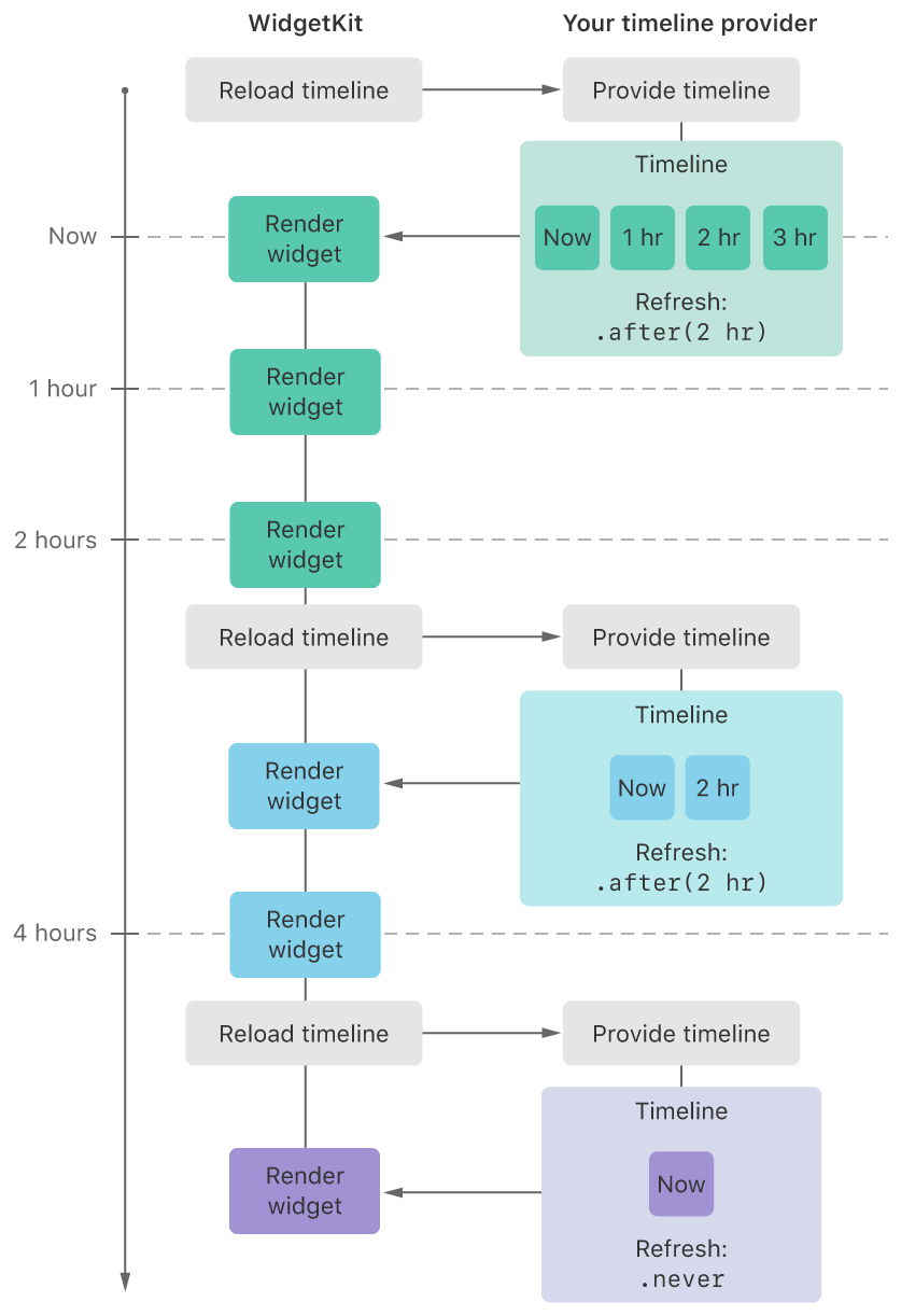 WidgetKit은 앱이 WidgetCenter를 사용하여 WidgetKit에 새 타임라인을 요청하도록 지시 할 때 까지