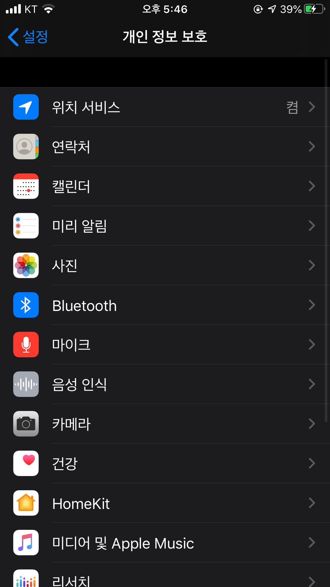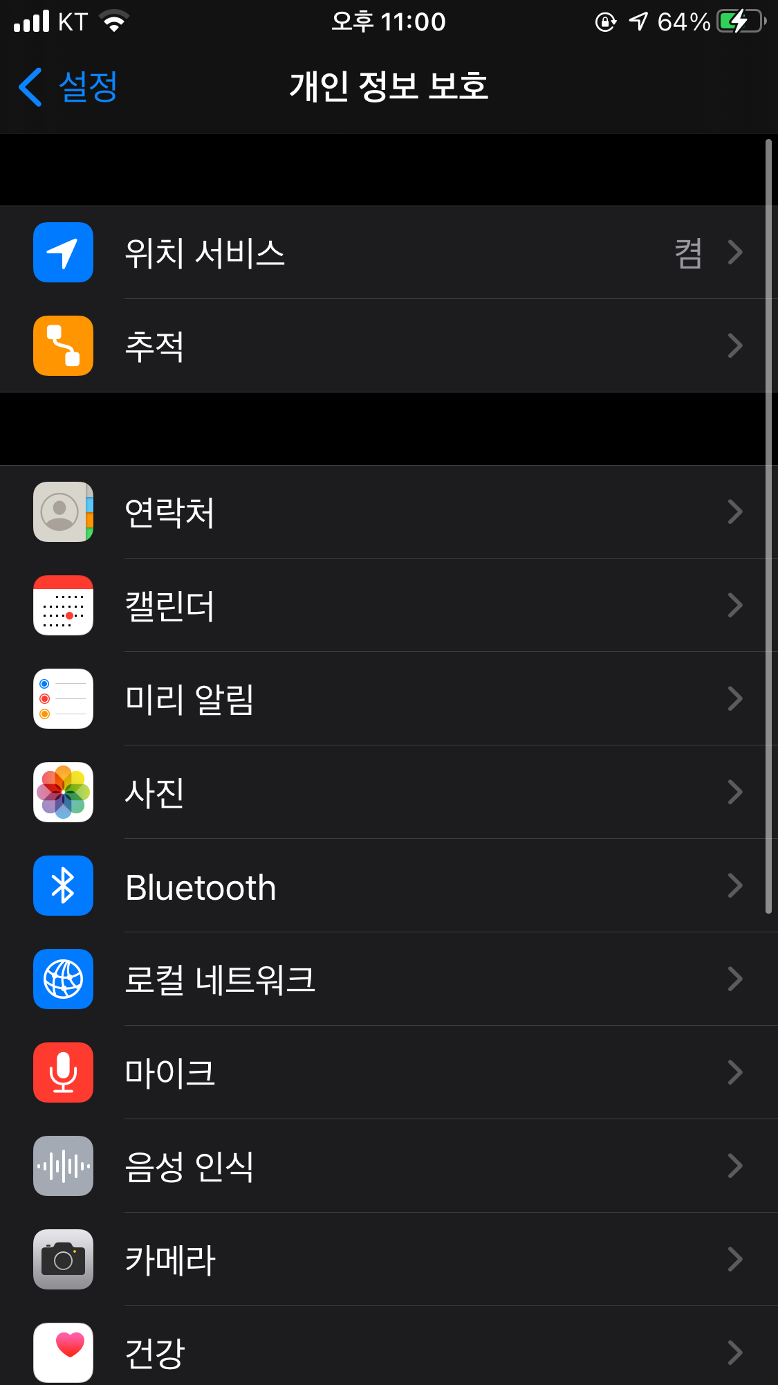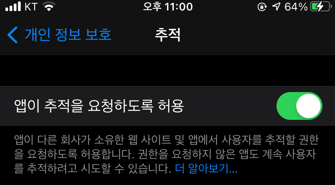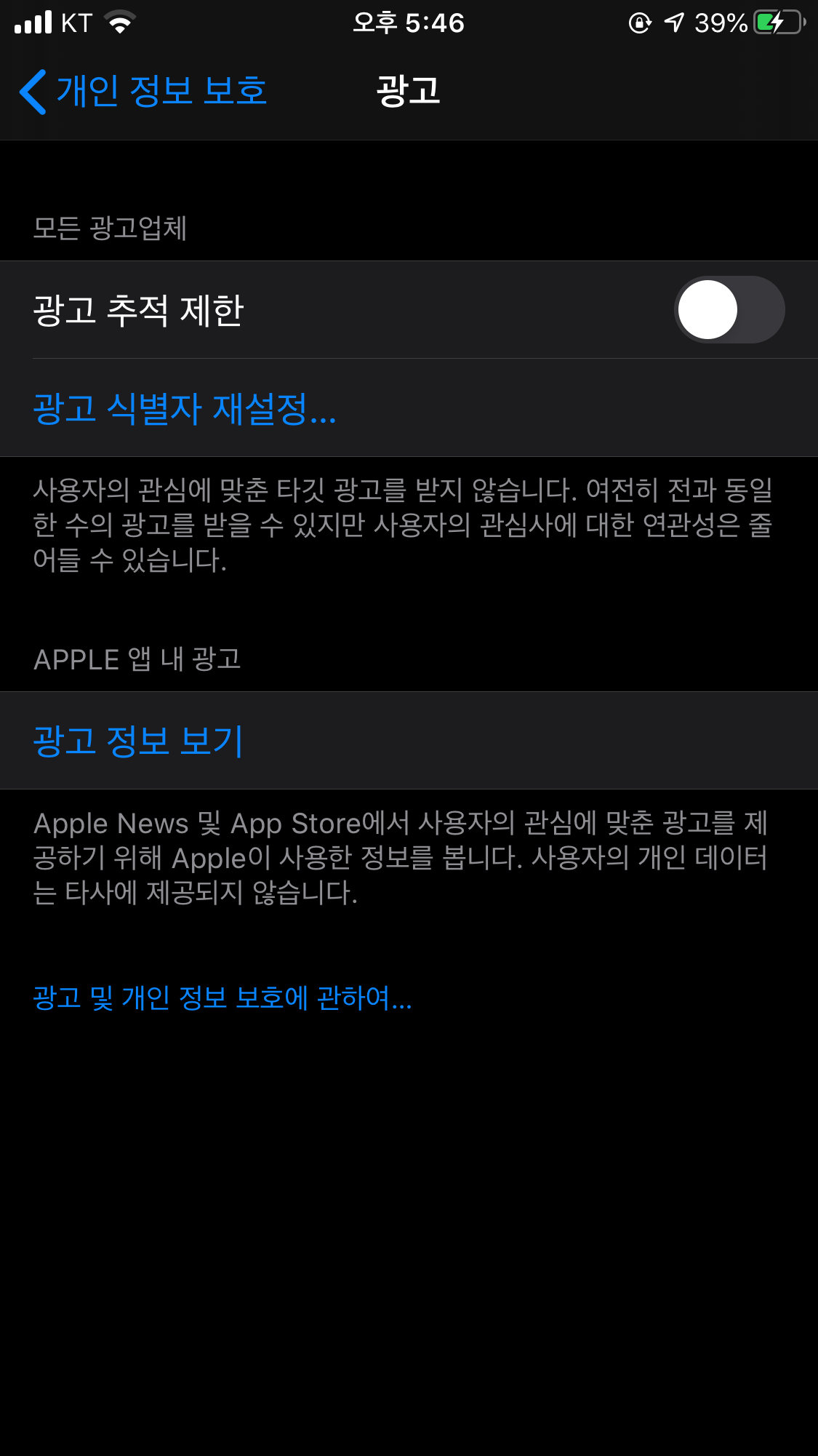 그 기능이 "추적"이 되어 위로 올라왔습니다. (가장 하단에는 "Apple 광고"라고 따로 있음)