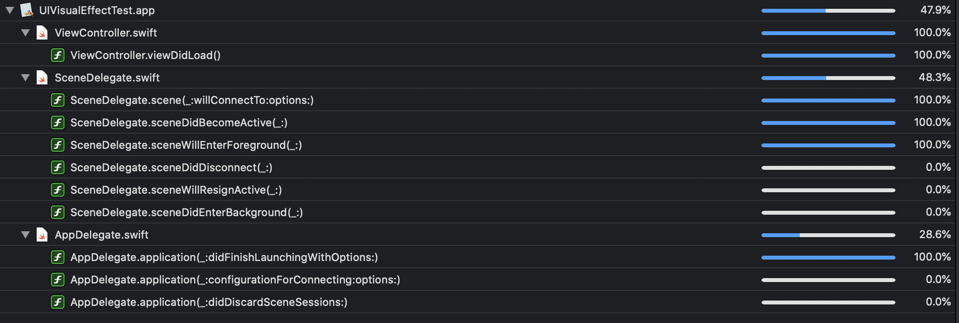 이렇게 AppDeleage, SceneDelegate, 첫화면인 ViewController까지 0%로 나오게 됩니다.