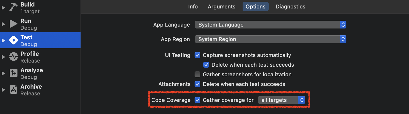 Code Coverage 모으도록 체크할 수 있습니다. allTargets으로 할 수도 있고,