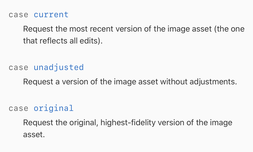 original : 원본 버전. 편집 내용에 관계없음.이미지 asset에 여러 형식의 데이터가 포함된 경우, 결과 이미지 데이터는 최고 품질 형식(highest quality format)을 사용.