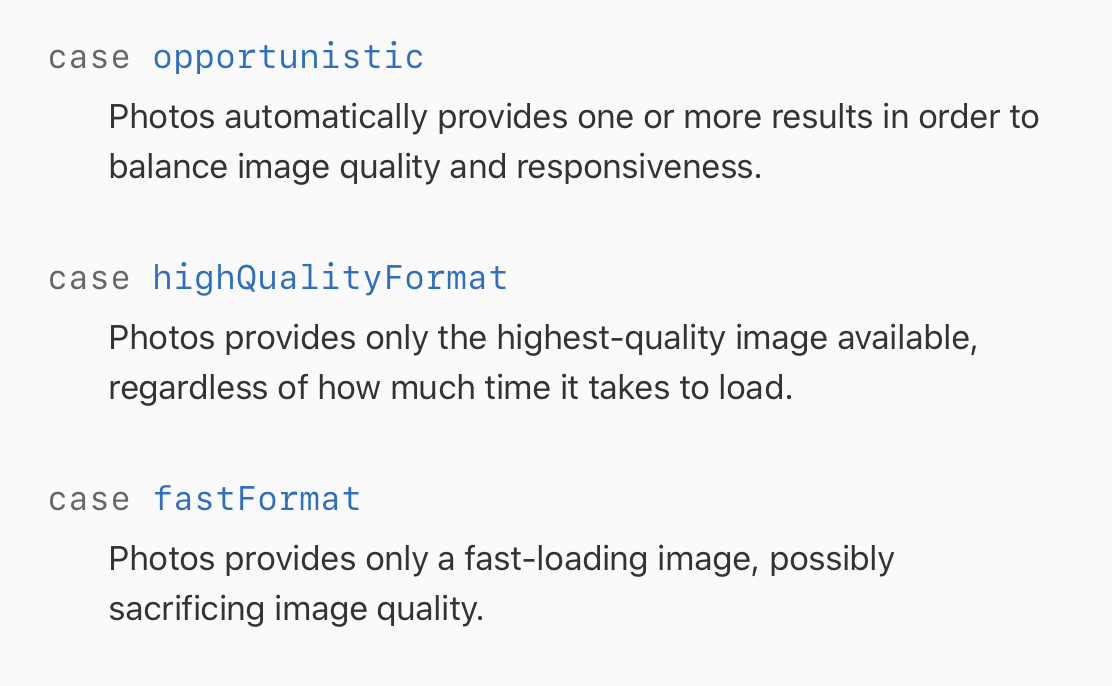 그래서 isSynchronous가 true일 때 highQualityFormat가 기본값이 되는거고, 다른 deliveryMode를 설정해도 소용이 없는거다.