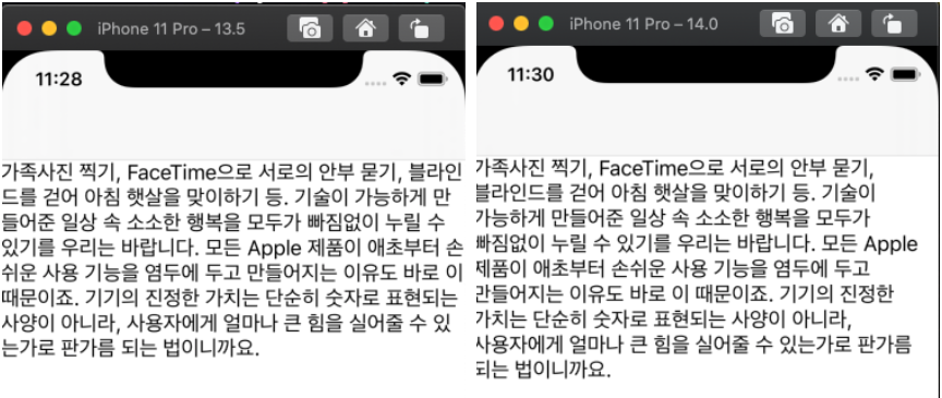 왜냐하면 iOS 14.0에서는 lineBreakStrategy가 standard로 들어가는 것 같고,
