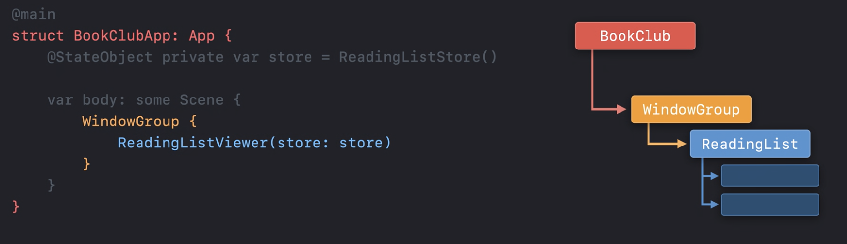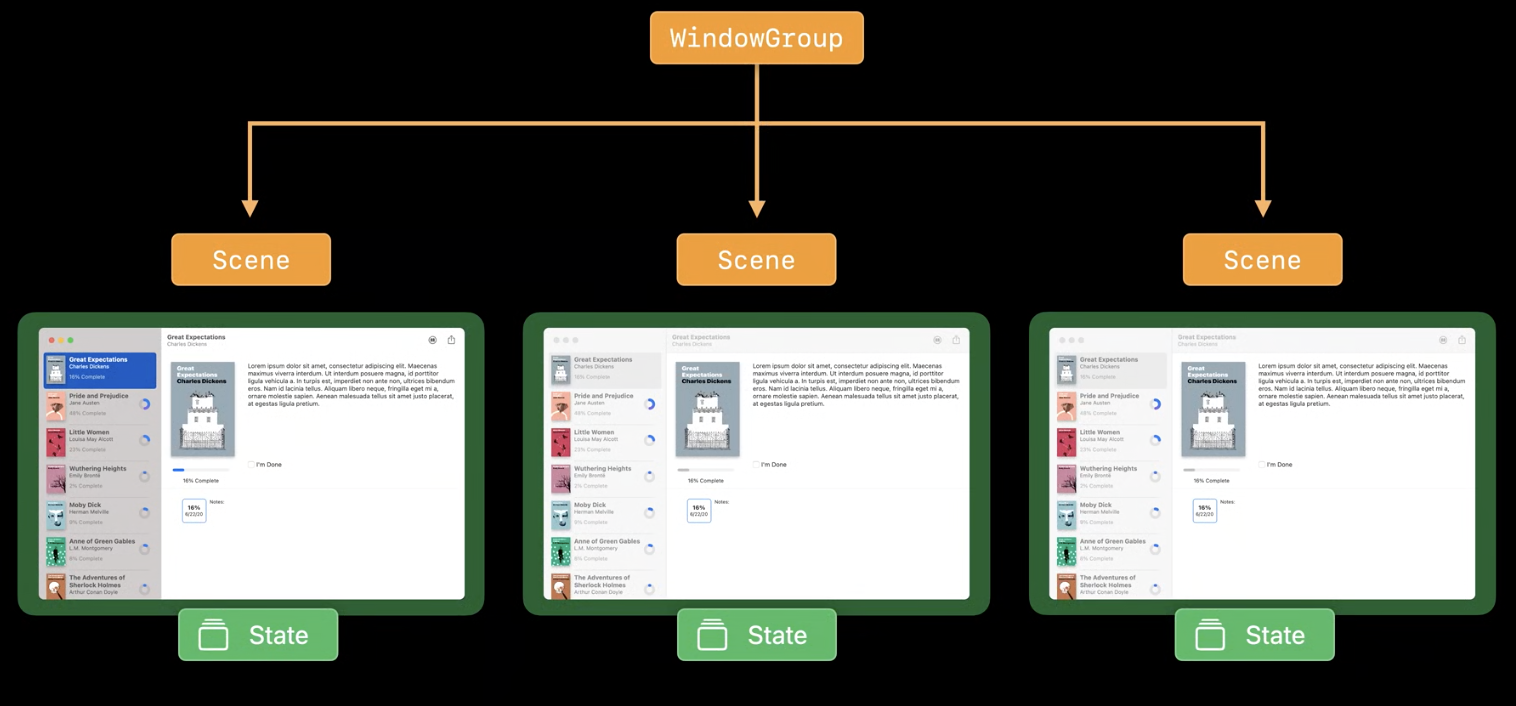 ==> WindowGroup은 iPadOS / macOS와 같이 여러 window를 지원하는 플랫폼에서 여러 자식을 인스턴스화 할 수 있음.