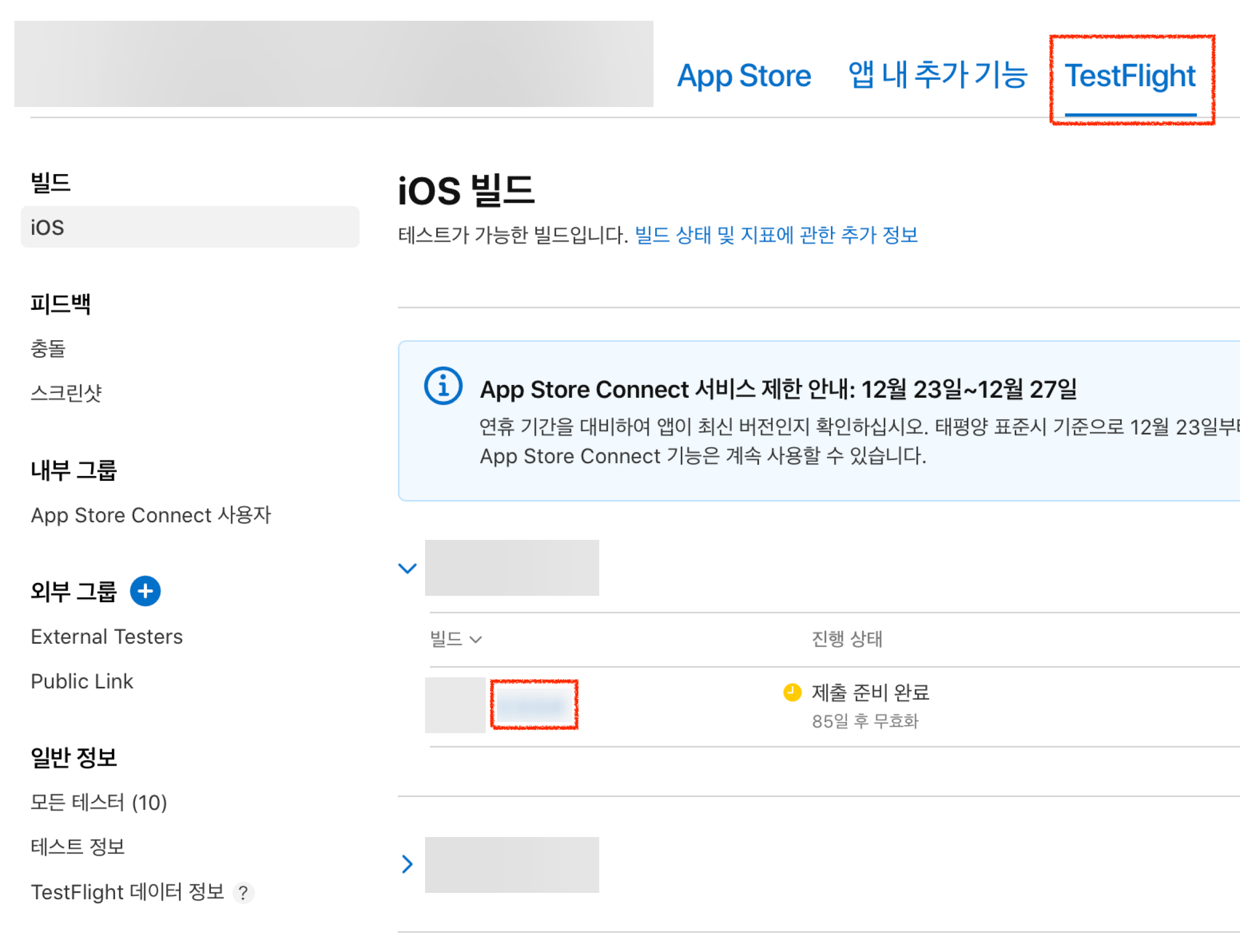1. TestFlight탭에 들어가 dSYM을 받고싶은 빌드를 클릭해줍니다.