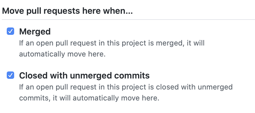 - Closed with unmerged commits : PR이 merge되지 않은 채 닫히면 자동으로 Done으로 옮겨주는 설정