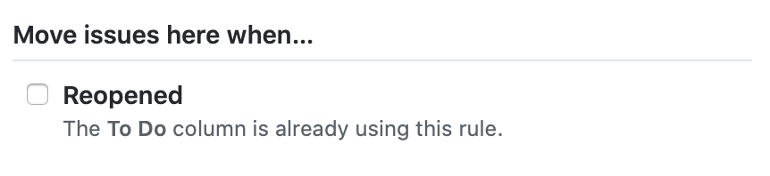 Reopened - close 된 이슈가 이 프로젝트에서 reopen되었을시, 자동으로 To Do쪽으로 옮겨지게되는 설정.