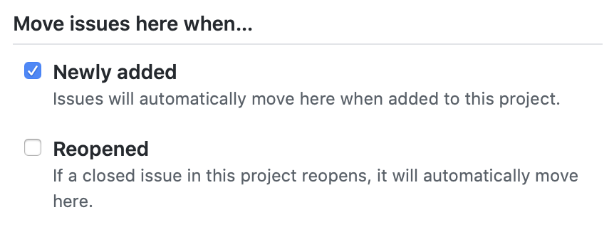 Newly added - 이 프로젝트에 추가된 이슈를 만들면, 해당 이슈는 자동으로 Todo에 들어가게 해주는 설정.