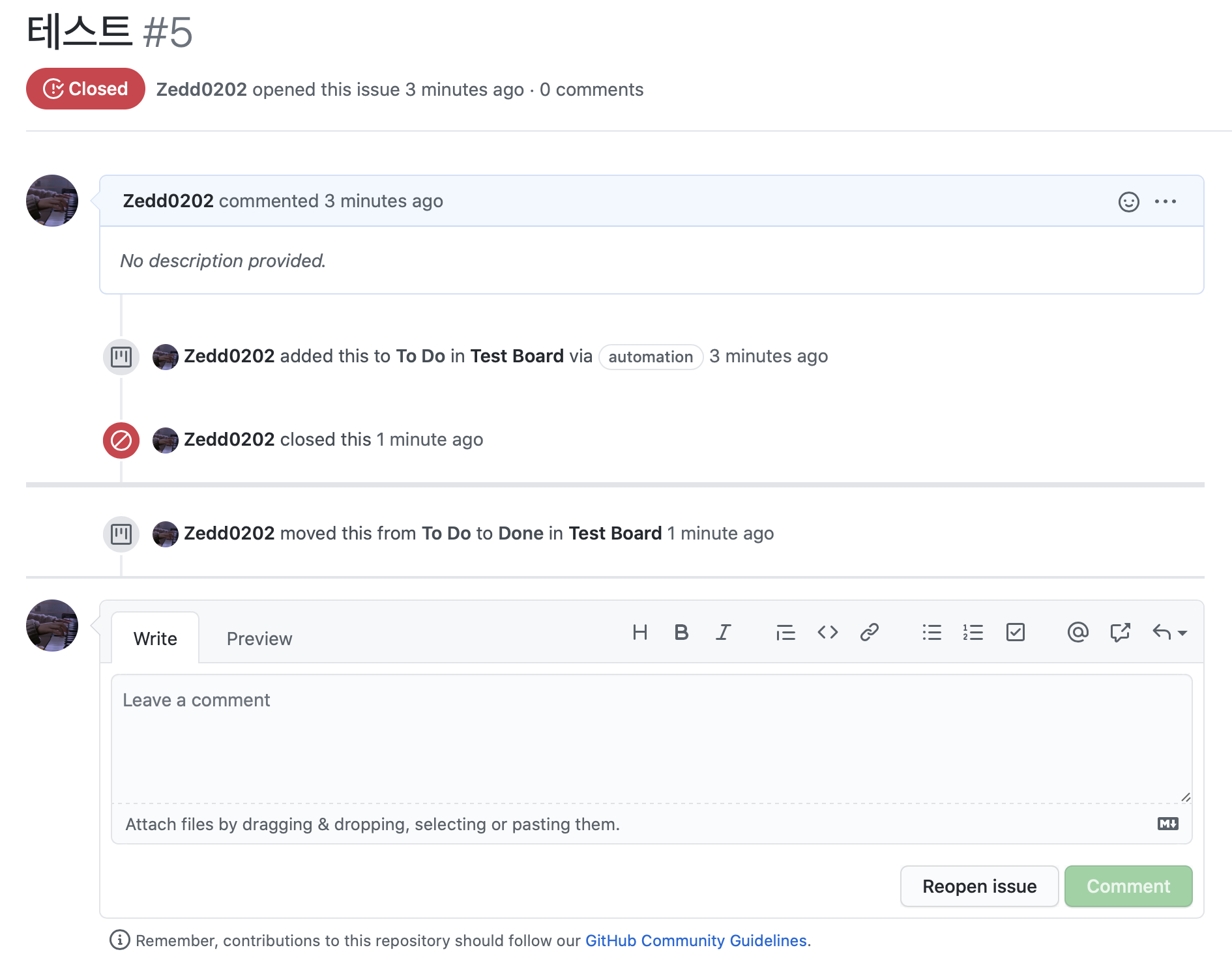 Done Column이 만들어져있다고치고..해당 이슈를 끝내고 Done쪽으로 옮겼습니다.