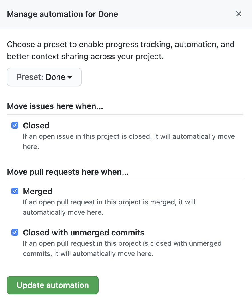 - Pending approval by reviewer : 리뷰어가 requests changes를 하거나, 필요한 최소 승인 리뷰 수를 충족하지 못할 때 자동으로 이 Column(Review in progress)으로 이동하겠다는 말입니다. Approved by reviewer 설정이 활성화 된 경우 권장된다고 합니다.