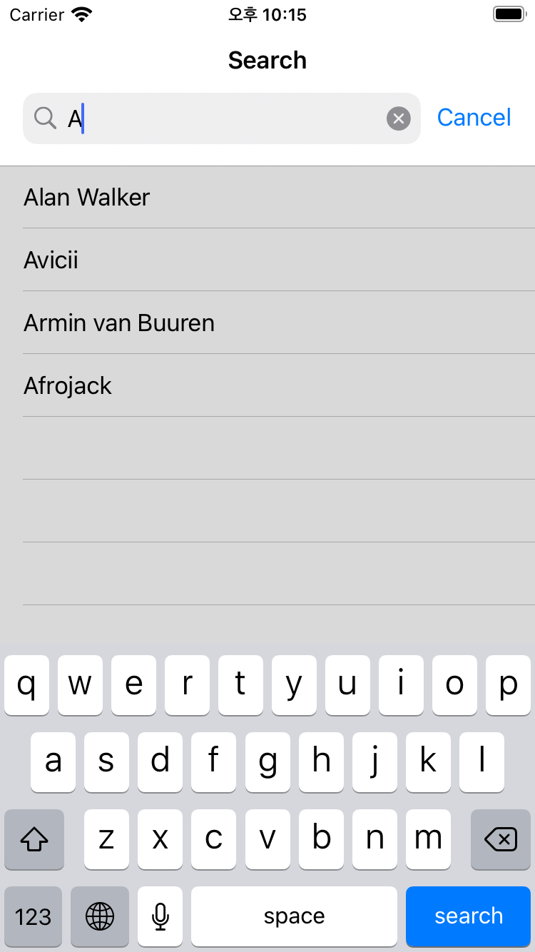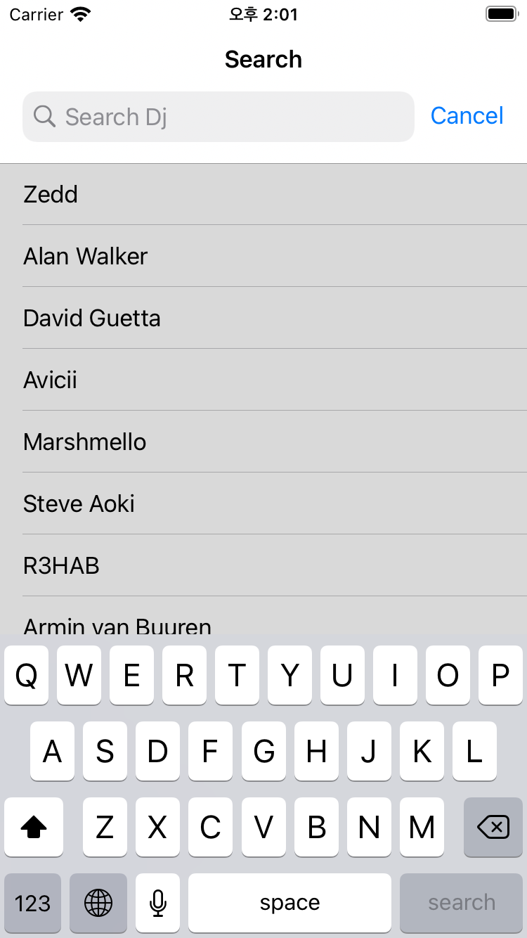 여기서 1, 2번일때는 저렇게 Dj들을 그냥 보여주고 싶기 때문이죠. 내가 검색어를 입력했을때만 TableView에 관련 아이템들이 나왔으면 좋겠는겁니다.