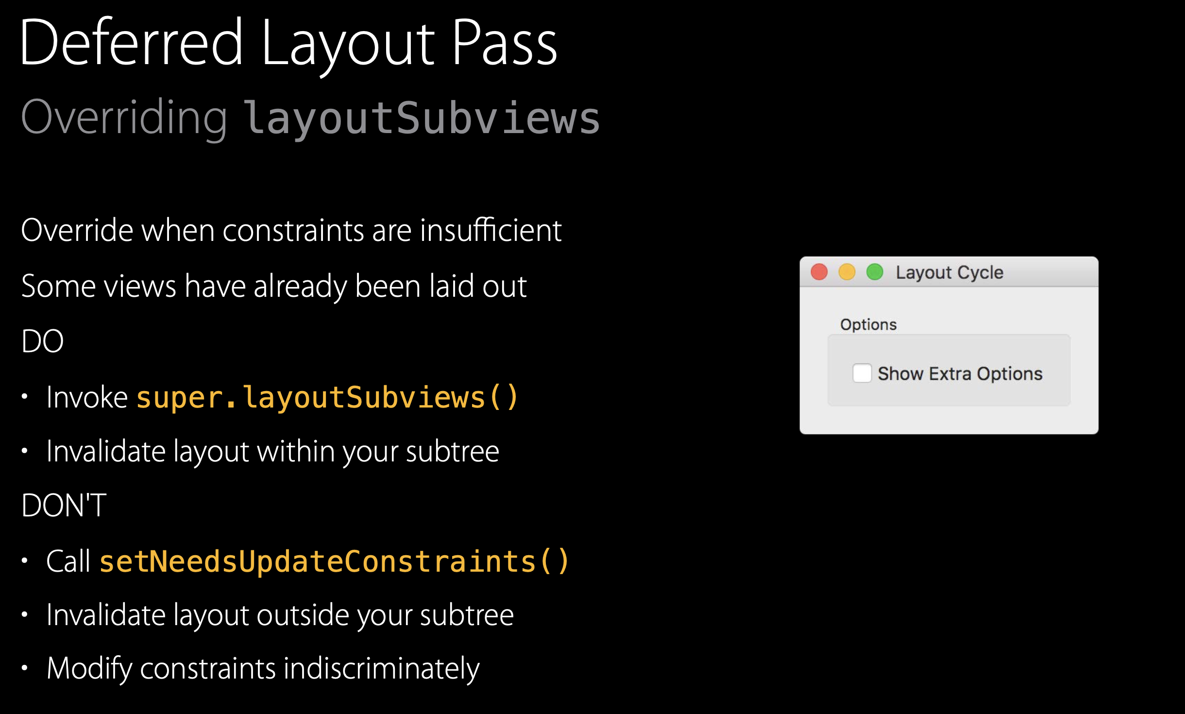 - Constraints를 사용하여 표시 할 수 없는 레이아웃이 필요한 경우에만 layoutSubviews를 override해야합니다.