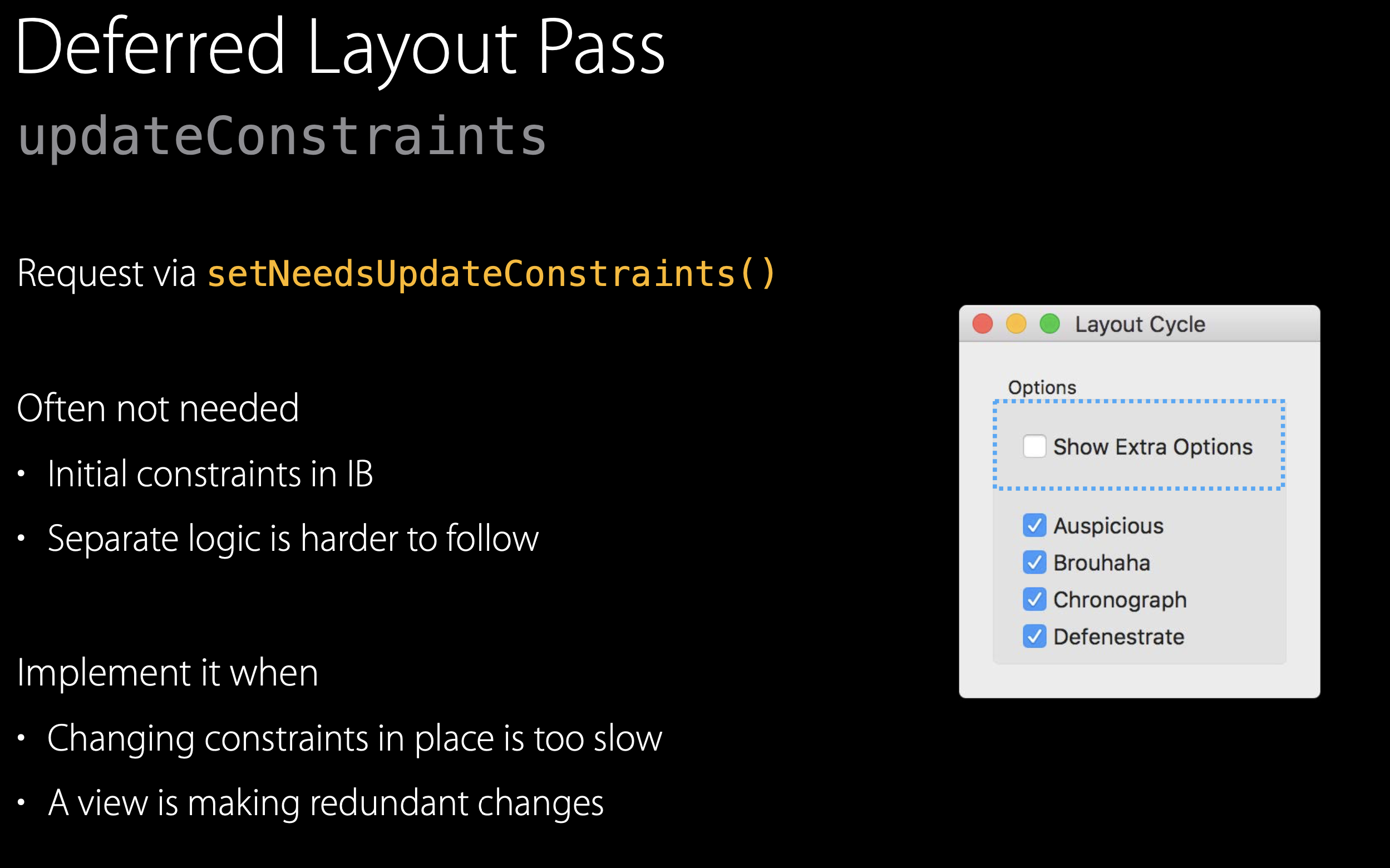 updateViewConstraints()내에서 Constraints를 변경하는 것이, 다른 시간에 constraints를 변경하는 것보다 실제로 더 빠르다고 합니다.