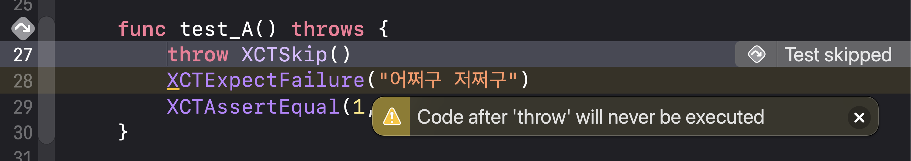 위 코드에서와 같이 XCTSkip을 사용하면, 아예 아래 코드들은 실행조차 안하고 테스트를 스킵해버립니다.