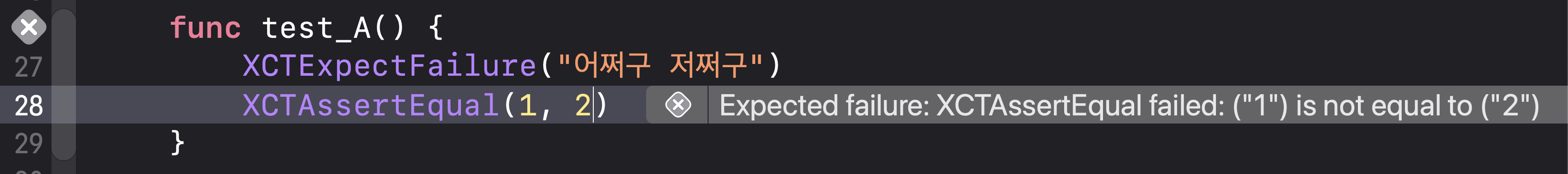 하지만 XCTExpectFailure가 있으면 테스트는 계속 실행되게 되죠.
