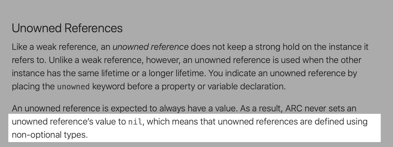 즉 unowned 프로퍼티는 nil이 될 일이 없어요.