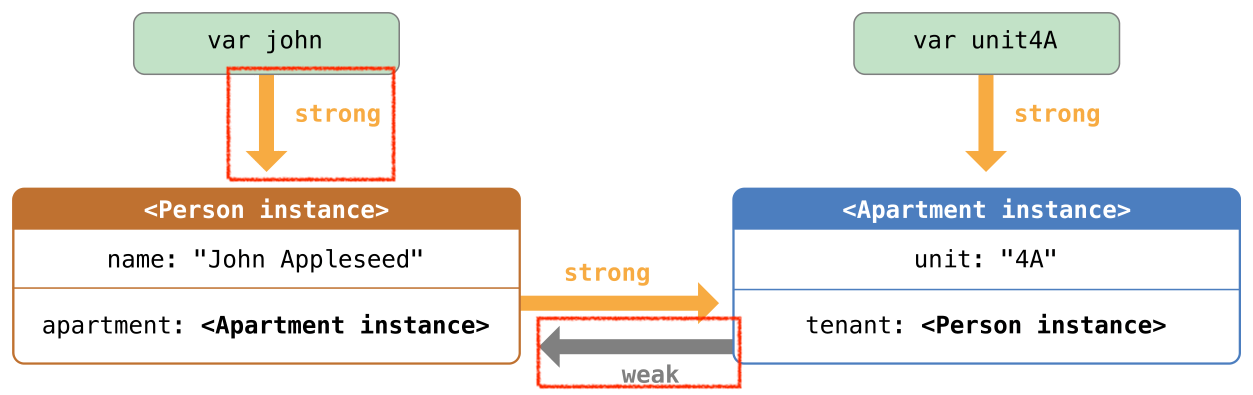 Apple : 다른 인스턴스의 수명이 더 짧은 경우 즉, 다른 인스턴스를 먼저 할당 해제 할 수있는 경우 weak(약한) 참조를 사용합니다.