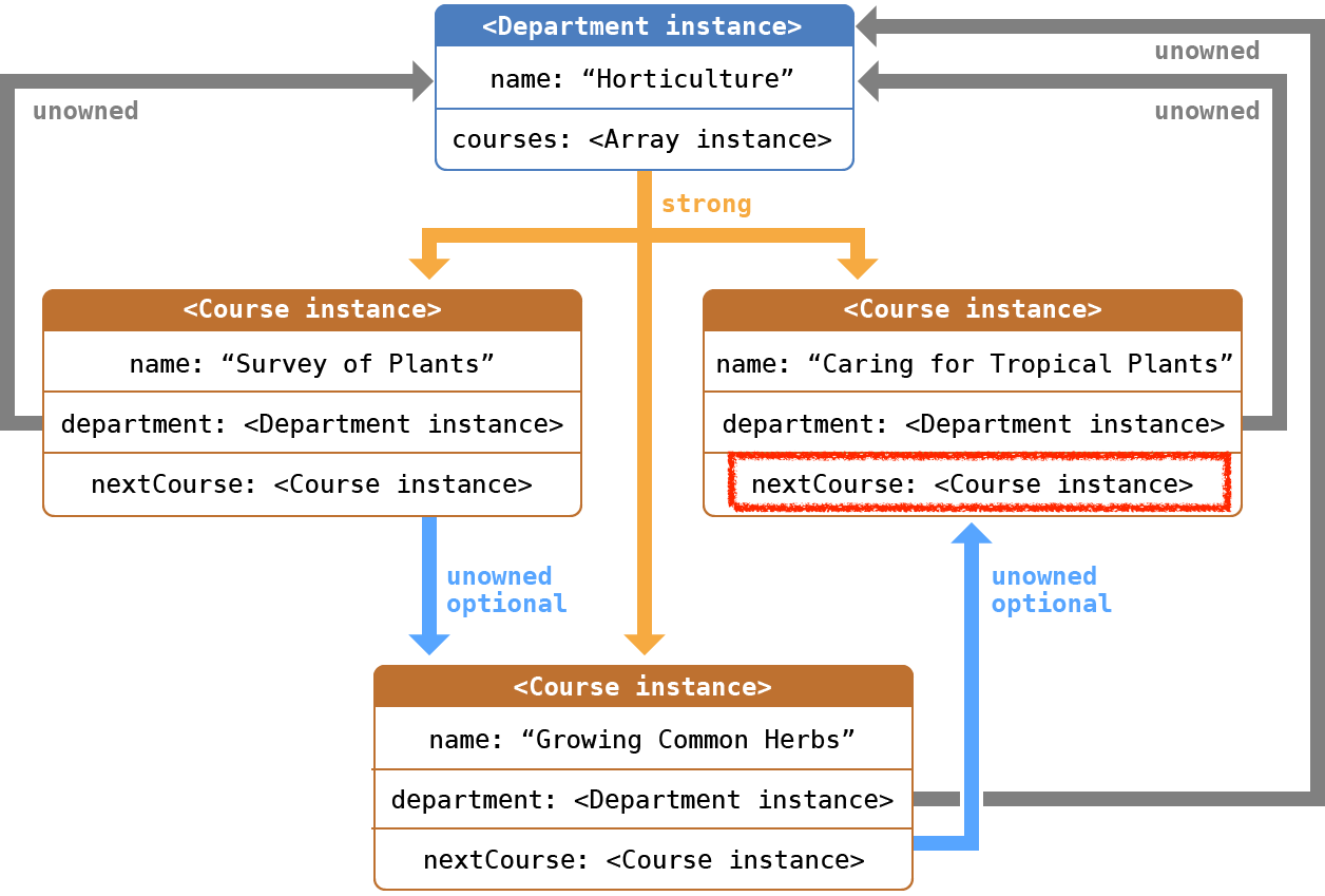 non-optional unowned references와 마찬가지로 nextCourse가 항상 할당해제 되지 않은 과정을 참조하도록 해야합니다.