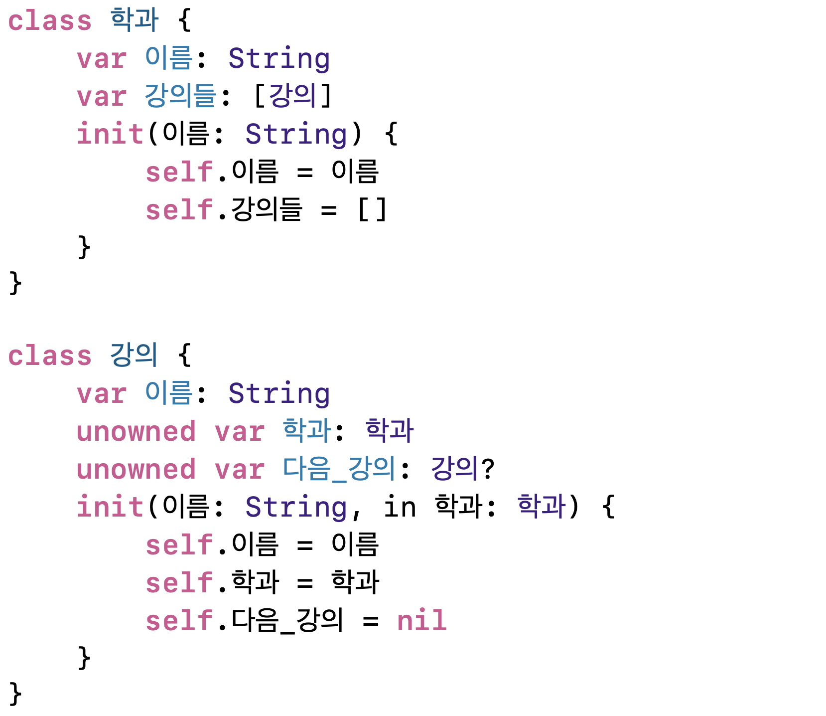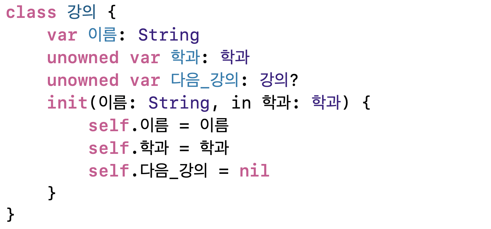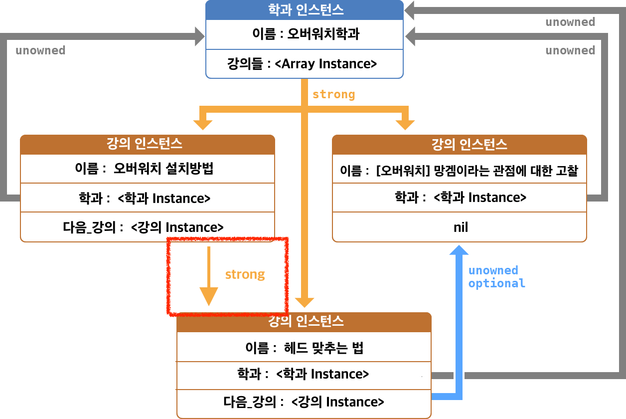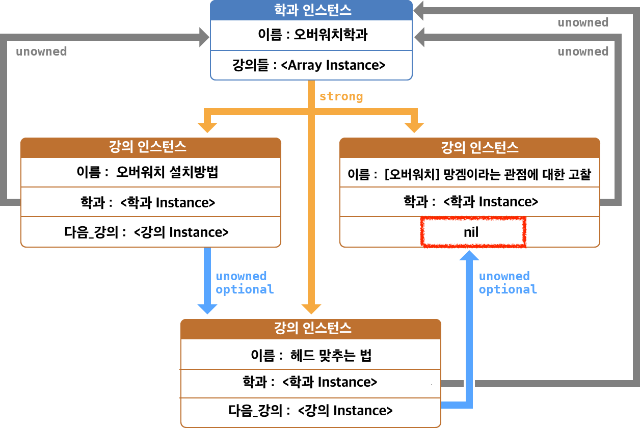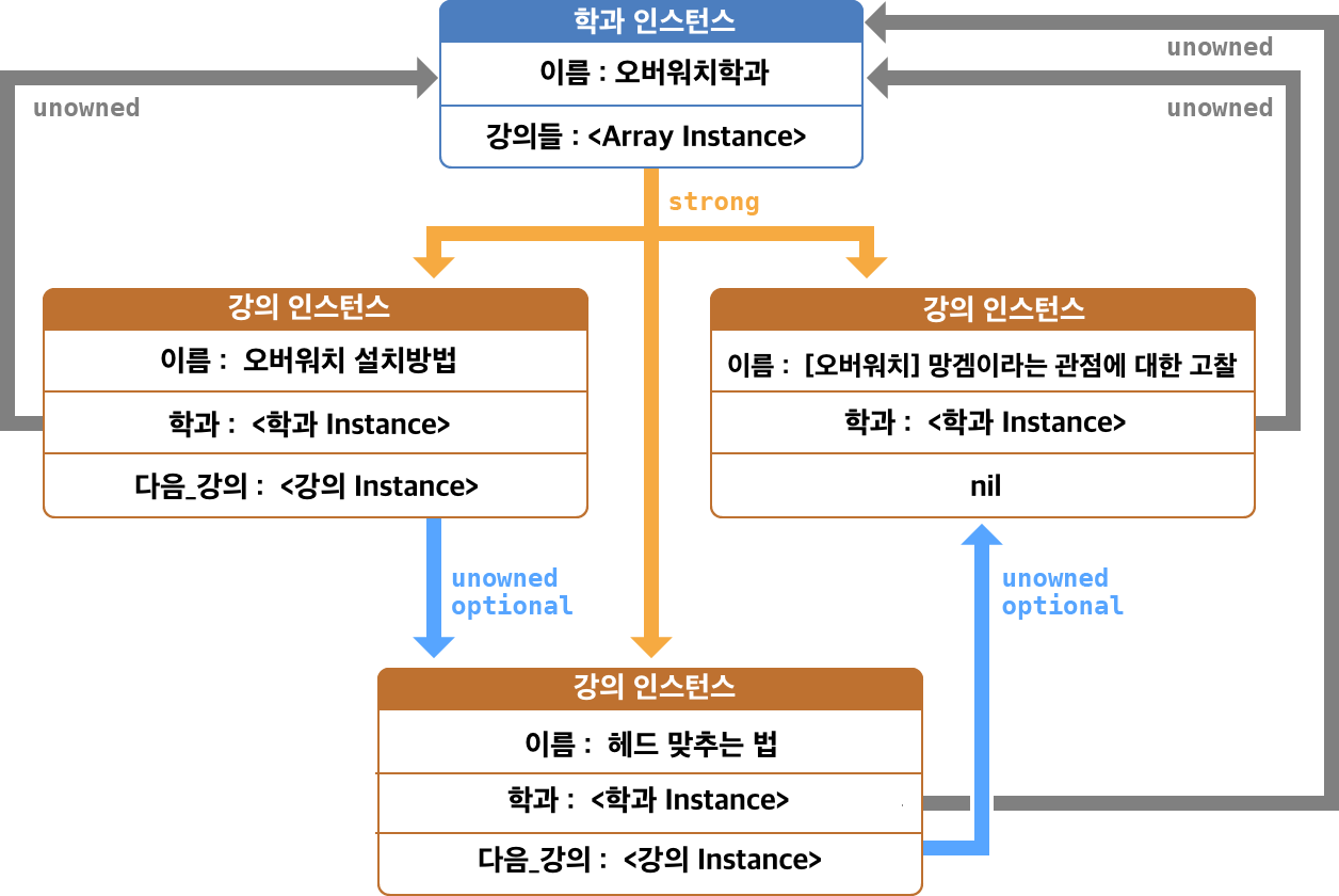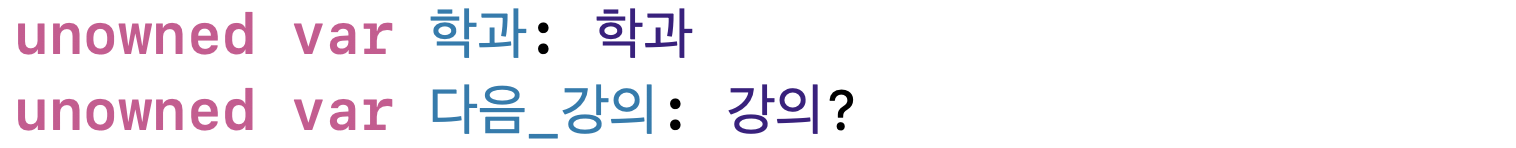 - 학과가 강의를 소유하는것이지 강의가 학과를 소유하는것이 아니죠? 학과가 나보다 메모리에서 먼저 해제될 일은 없기 때문에 unowned로 선언해준 것 같습니다.