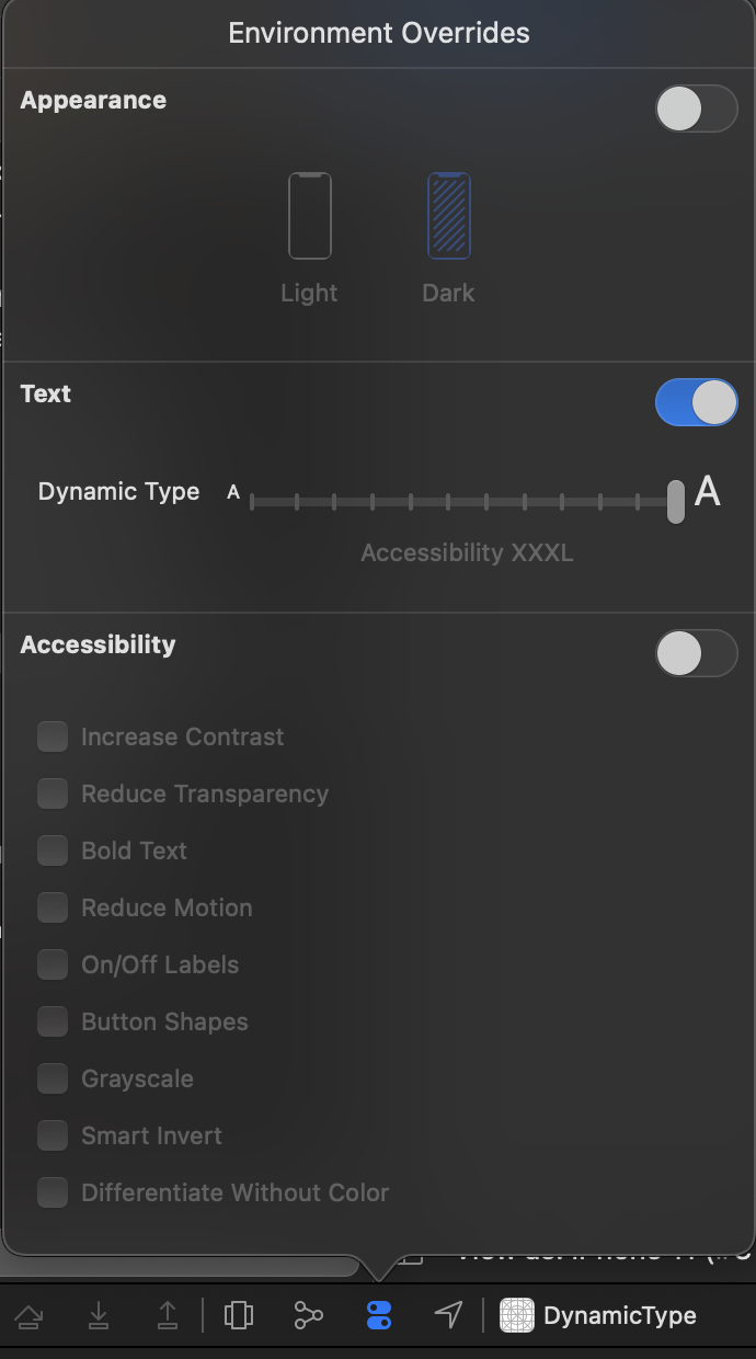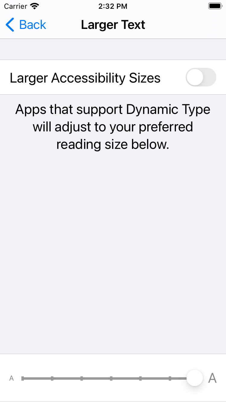 왼쪽 그림처럼 기본적으로 7단계의 category가 있고, Larger Accessibility Sizes를 on하면 5단계가 더 늘어난다.