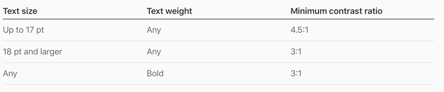일반적으로 더 작거나 가벼운 text는 가독성을 위해 더 큰 대비를 가져야 함. 다음 가이드라인을 따를 것.