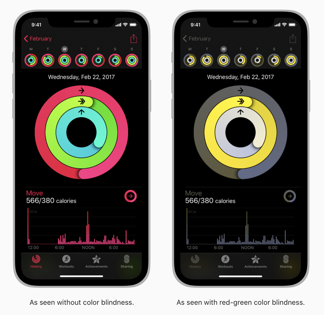 앱에서 color를 사용하여 정보를 전달하는 경우, 색맹 사용자도 이해할 수 있도록 text labels 또는 glyph를 제공해야 한다.