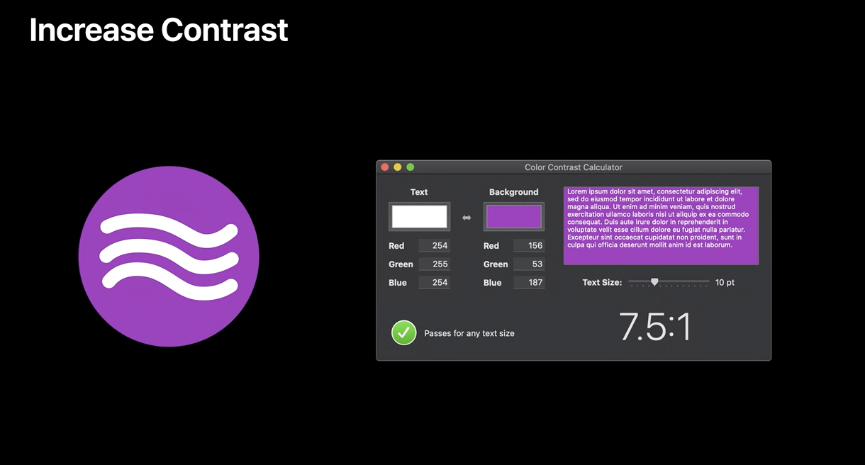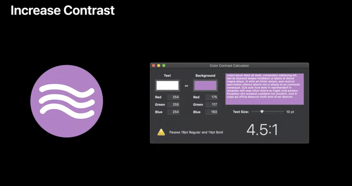 text, glyphs, controls과 같은 UI 요소의 color 대비를 높이면 더 많은 사람들이 더 많은 상황에서 앱을 사용하도록 도울 수 있음.