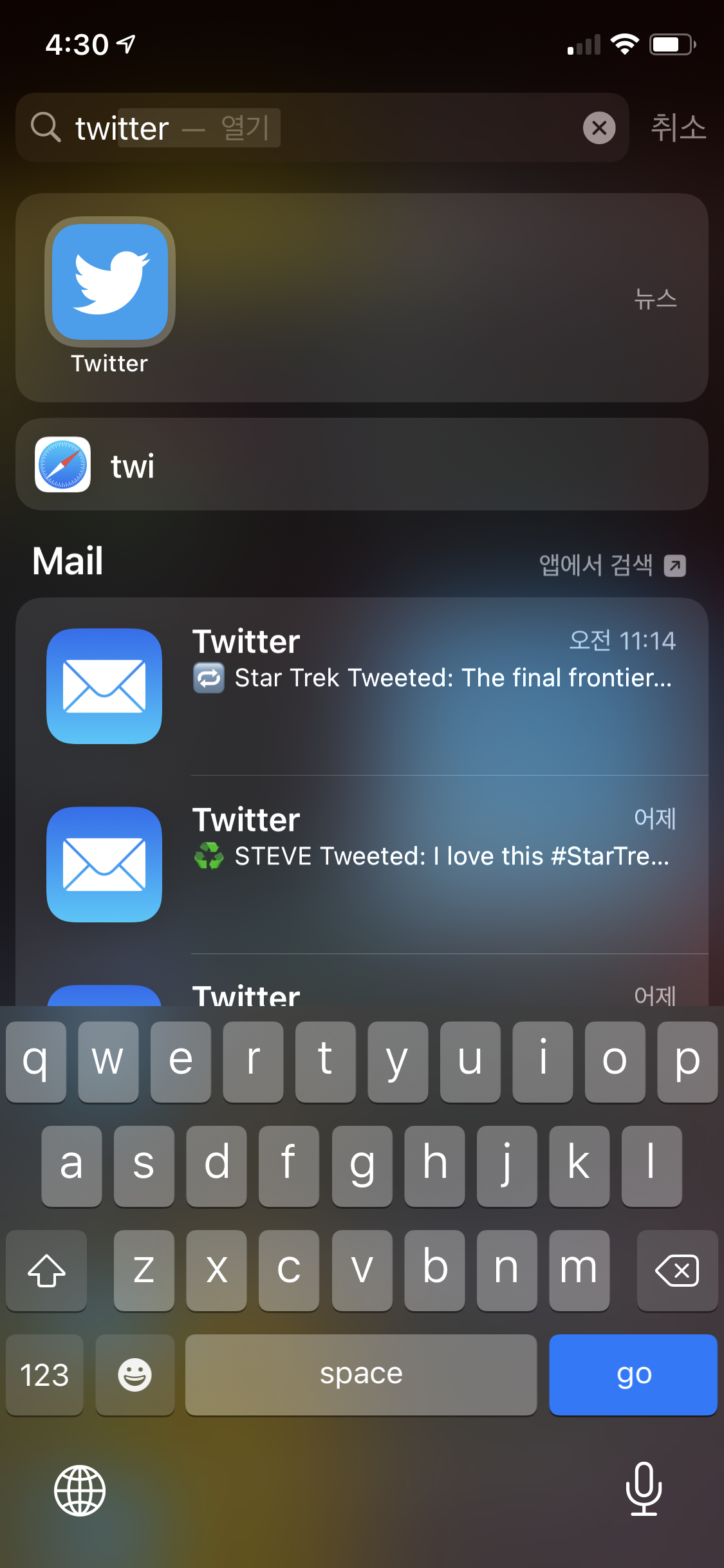 이런식으로 App을 search할 수도 있지만, App내의 content를 search할 수도 있습니다.