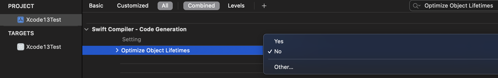 ARC 최적화가 코드에 미치는 영향을 알 수 있도록 Xcode Setting에 "Optimize Object Lifetimes"를 넣음.