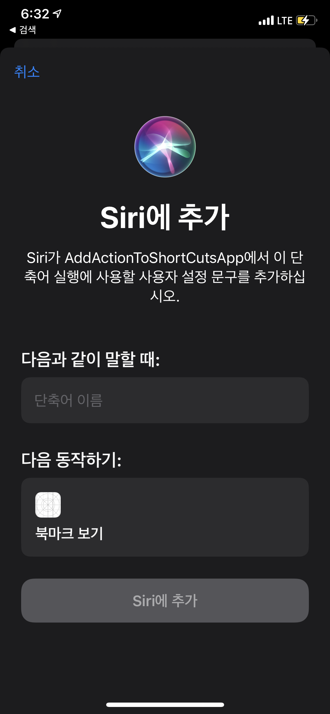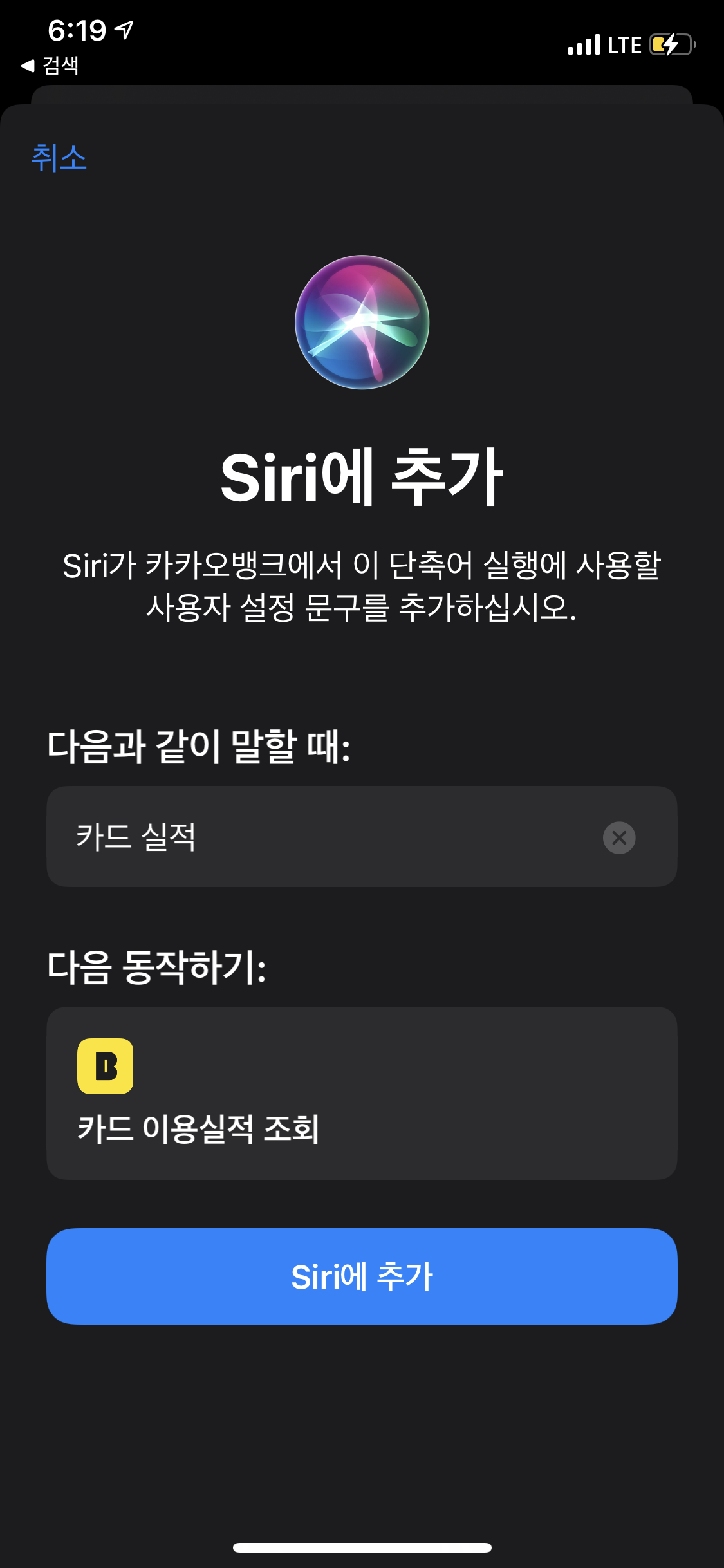 왼쪽 카뱅, 오른쪽 내 앱...단축어 이름이 채워져있지 않아 Siri에 추가가 활성화가 안되어있음.