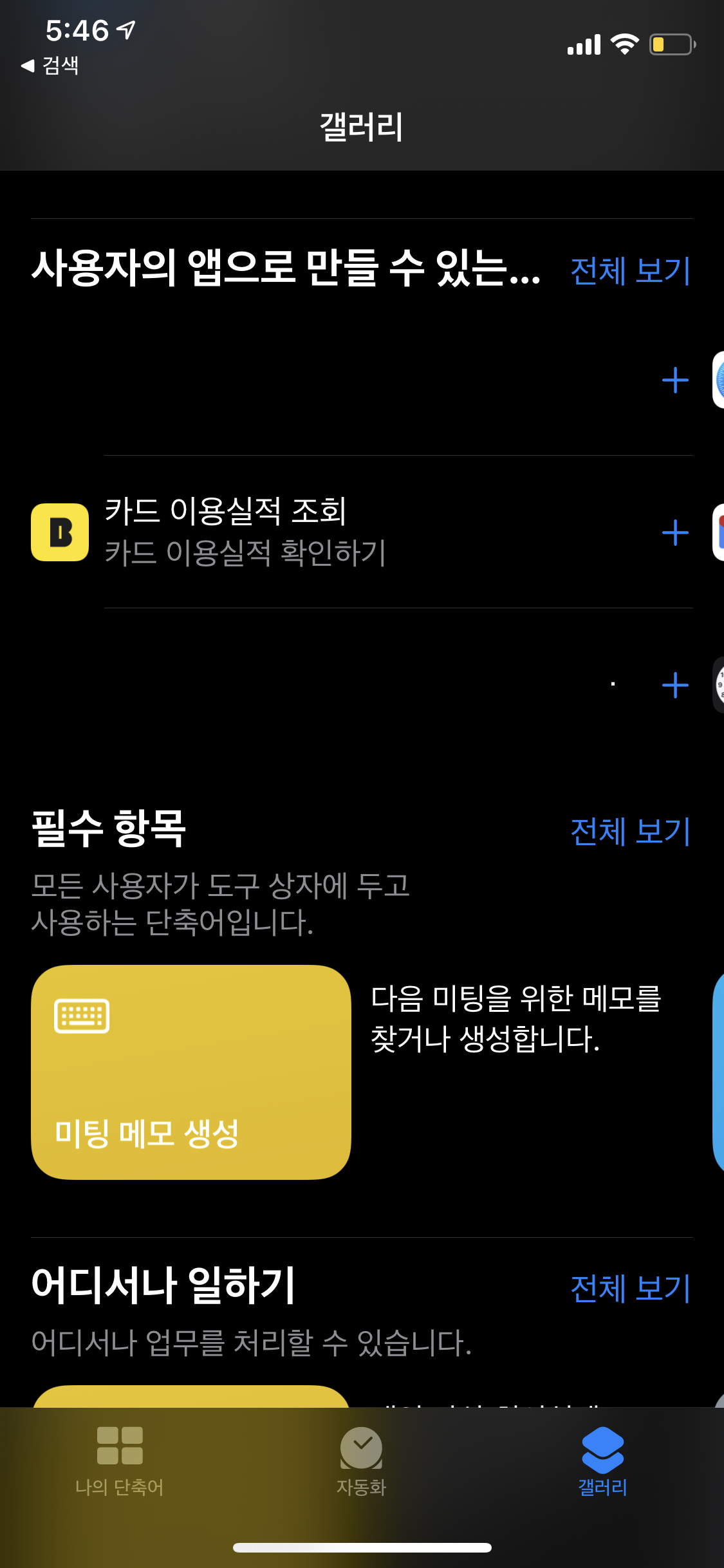 단축어 > 갤러리 탭 > 사용자의 앱으로 만들 수 있는 단축어