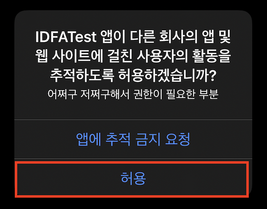 앱이 추적을 요청하도록 허용이 ON되어있기 때문에, 오른쪽과 같은 팝업이 뜬 상태라고 가정한다.