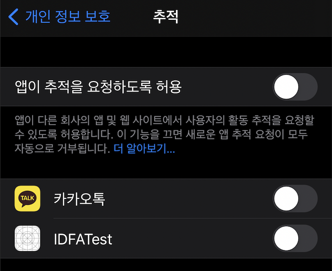 1) 앱이 추적을 요청하도록 허용이 OFF되어있으므로