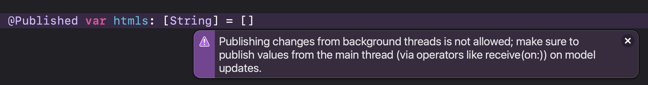 Publishing changes from background threads is not allowed; make sure to publish values from the main thread (via operators like receive(on:)) on model updates.