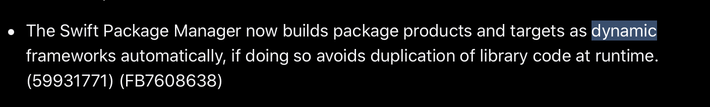 (내가 이해한게 맞다면) Xcode 12.5부터 package product과 target이 dynamic framework로 빌드한다는데..