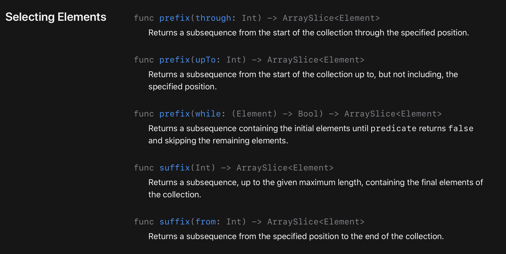 prefix / suffix 친구들은 Array의 인스턴스 메소드이지만, return 타입은 ArraySlice<Element> 입니다.