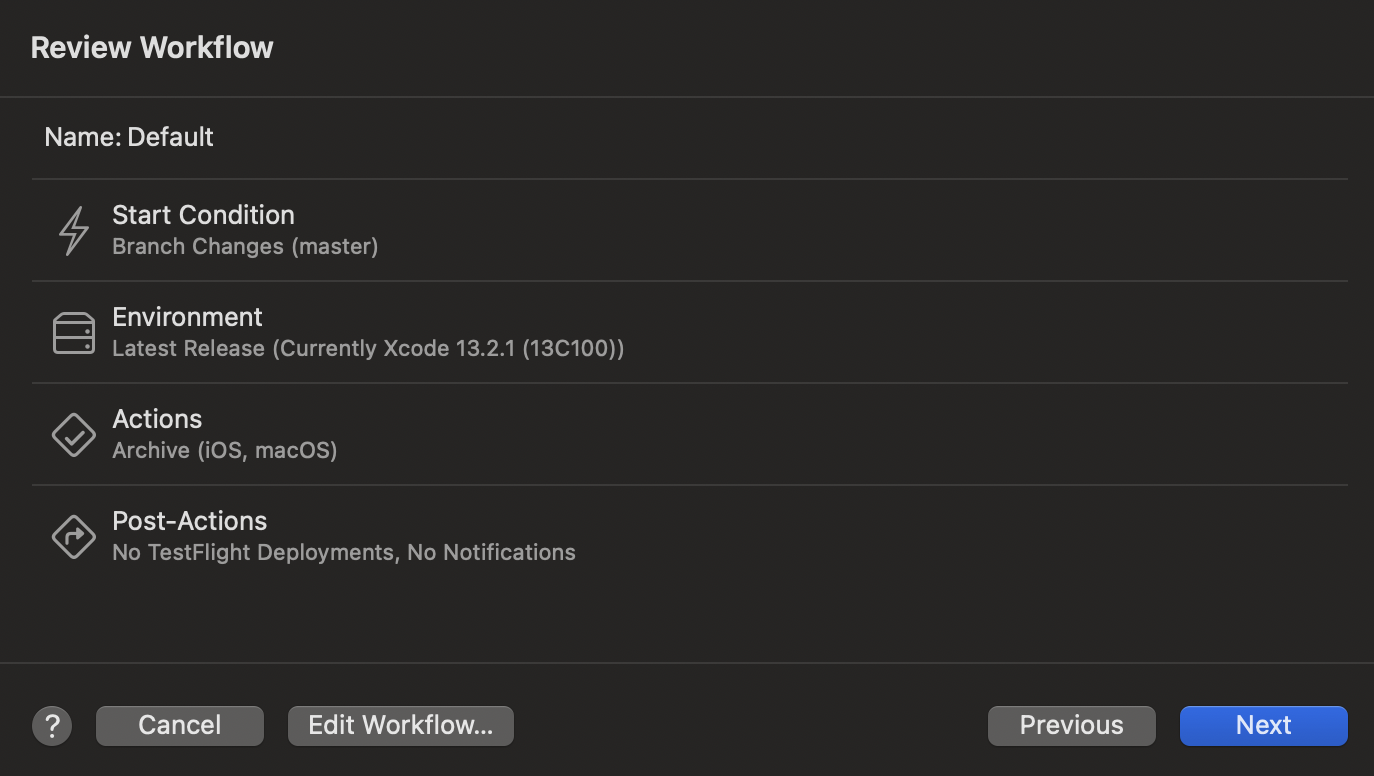 Create Workflow를 누르는 순간, Xcode는 해당 프로젝트를 분석합니다.