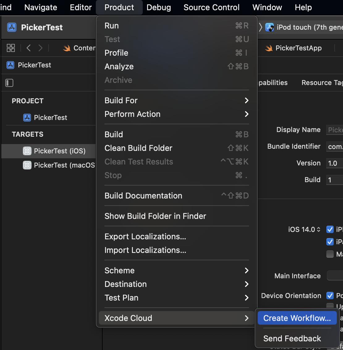 Xcode > Product > Xcode Cloud > Create Workflow를 선택해주세요.