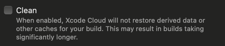 Clean이 enable되어있으면, Xcode Cloud는 derived data or 캐시에 빌드를 저장하지 않게되지만,