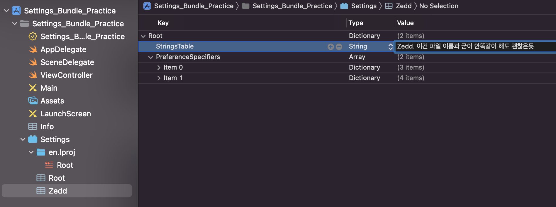 5. Root.plist로 가서 File을 "Zedd"로 지정
