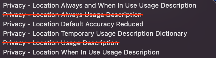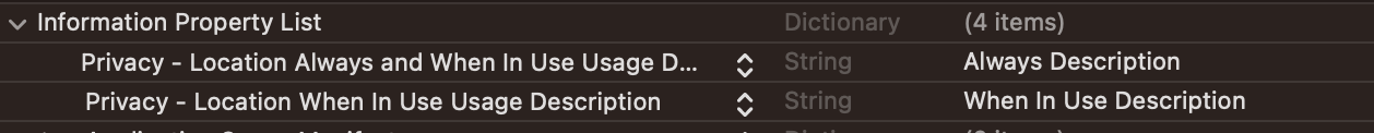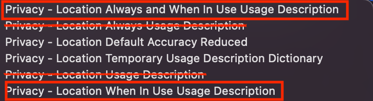 - NSLocationAlwaysAndWhenInUseUsageDescription
